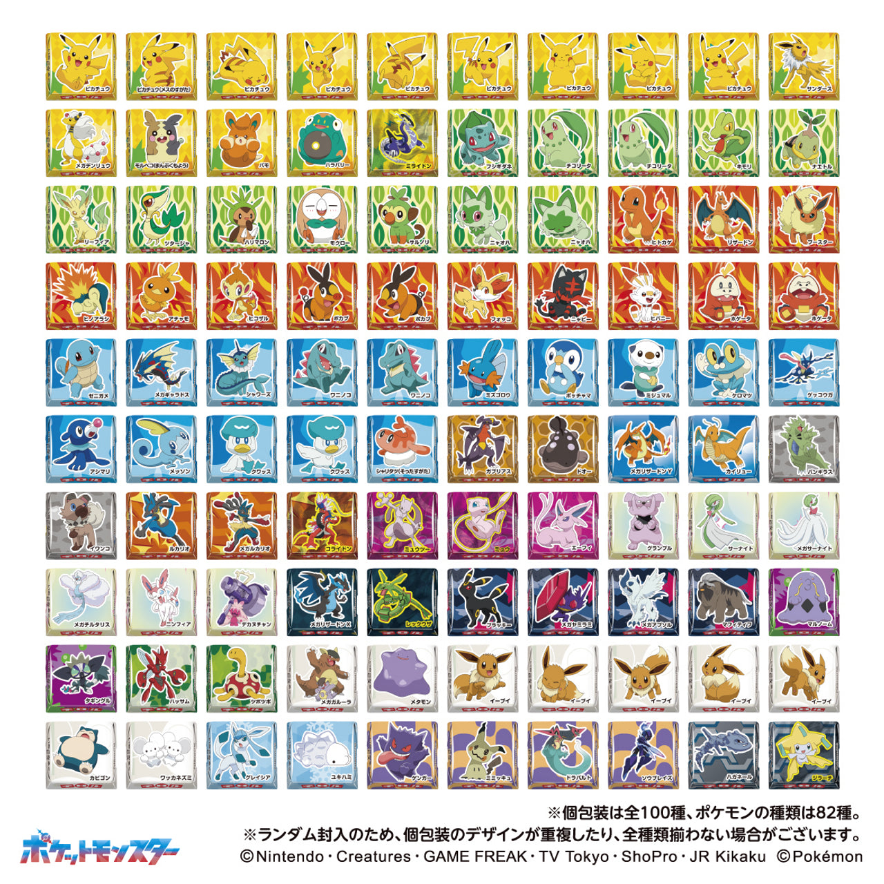 The product features a two-tone color scheme inspired by the Poke Balls from Pokemon. There are 100 package designs of the individual wrappings.